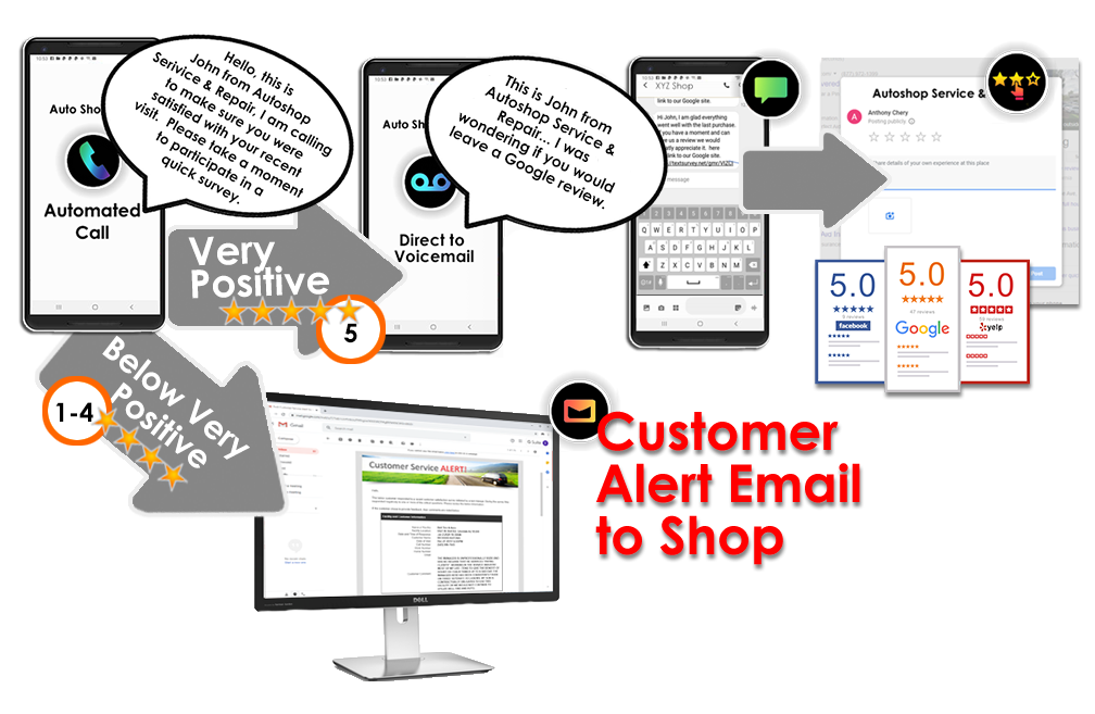 What happens next will help dramatically increase your business's 5-star reviews. If the customer provides a response that indicates they are totally satisfied, the system will send a follow up text message thanking them for their feedback and it will ask them to give you a social media review. The message will include link(s) to the review area(s) of the social media site(s) you are engaged with.