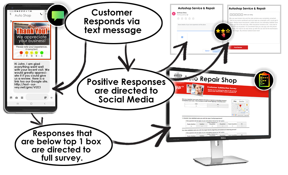 If a customer replies with a response that is less than totally satisfied, the system will send a second message with a link to a more thorough review. You will get specific information on opportunities for improvement.